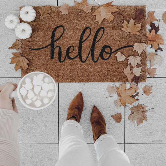 Endlich schöne Fußmatten aus hochwertigen Kokosfasern! Ist das nicht ein toller Empfang? Zaubert euren Gästen ein Lächeln ins Gesicht mit unseren Fußmatten. Die fein geschwungenen und handgeschriebenen Schriftzüge verleihen unseren Fußmatten einen edlen und modernen Touch. Die Vorderseite besteht aus einer naturbelassenen Oberflächenstruktur aus 100% Kokosfasern. Die Rückseite besteht aus rutschfestem Vinyl, was die Fußmatte sicher an ihrem vorgesehenen Ort fixiert. Das Format von 45 x 70 cm ist ideal für jeden Indoor Eingangsbereich!