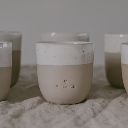 Wir haben sehr viel Herzblut in eine neue Kollektion gesteckt, die von der Form, dem Ton, dem Glazing, sowie dem Design von uns entwickelt wurde. Eine kleine Töpferei aus Portugal produziert diese wundervollen Becher in liebevoller Handarbeit & ist ein großartiger neuer Begleiter auf unserem kreativen Weg. Unsere Becher lassen die Herzen höher schlagen, die die Individualität von Ton & Glasur lieben, denn jeder einzelne Becher hat seinen ganz eigenen Touch. Da alle Becher mit der Hand gefertigt, gebrannt, geprägt, abgeschliffen, geglazt & nochmal gebrannt werden, gibt es Unterschiede in der Drucktiefe, in der Höhe sowie der Geradlinigkeit. Das minimalistische Design und die natürlichen Farbnuancen werden von einer wunderschönen Blindprägung “Glücklich” abgerundet. Wir sind verliebt & voller purer Freude & können es kaum abwarten unsere neue Kollektion in Euren Händen zu sehen!