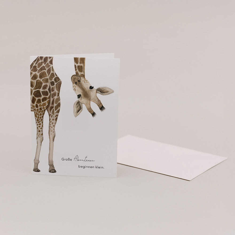 Unsere Klappkarte Giraffe – Große Abenteuer beginnen klein ist die perfekte Begleitung für all die besonderen Momente im Leben. Mit der liebevoll handgemalten Giraffe, die in zarten Aquarellfarben von unserem Designteam in Hamburg gestaltet wurde, vermittelt diese Karte eine inspirierende und herzliche Botschaft.